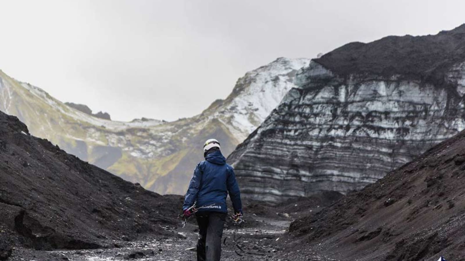 Walking through the volcanic ice tunnel itself, where the glacier walls reveal layers of ash from Katla's eruptions. The contrast between black basalt sediment and blue-white ice is disorienting in the best way.