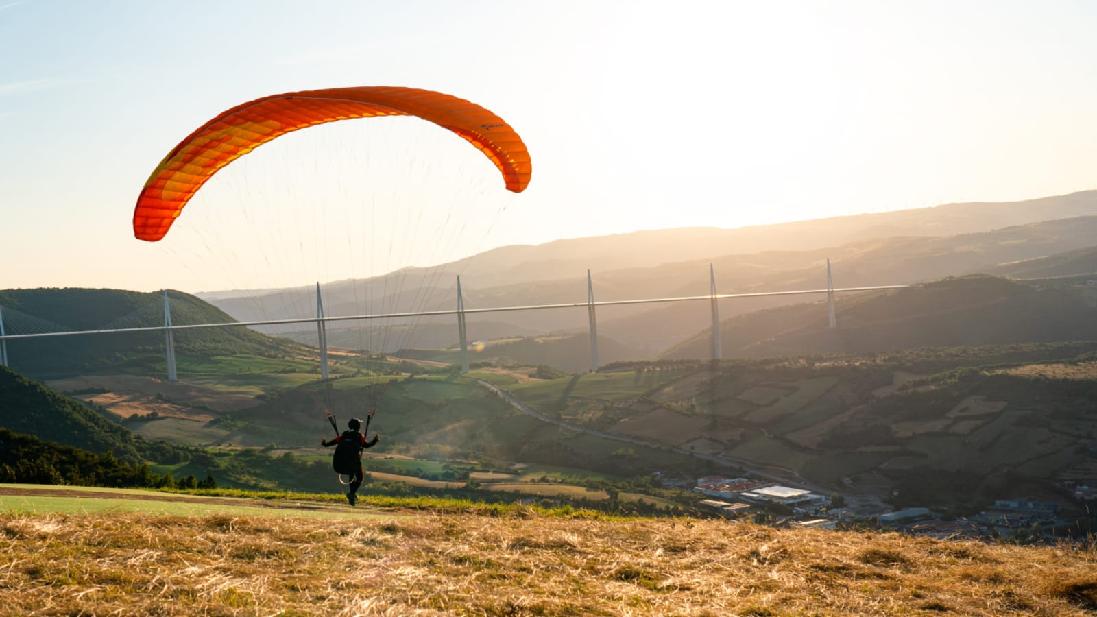Le décollage depuis les causses autour de Millau : les premiers mètres où le sol disparaît sous vos pieds en quelques secondes. La phase de vol plane qui suit est plus calme, mais ce premier saut dans le vide reste le pic d'adrénaline du vol.